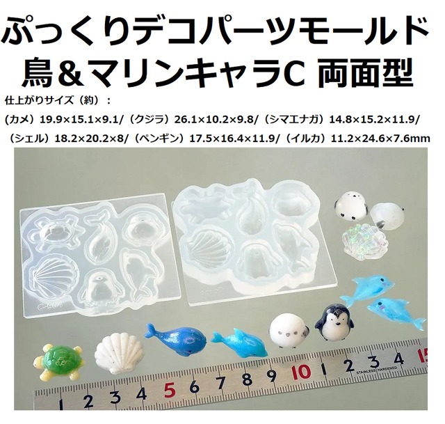 【 鳥&マリンキャラC 両面型】ぷっくりデコパーツモールド/鳥/シマエナガ/イルカ/シェル/クジラ/カメ/デコパーツ/手作りシール/動物 樹脂粘土をはじめとする自然乾燥粘土、オーブン粘土、UVレジンなどでご使用頂ける便利なシリコーン型です。 かわいい動物モチーフのデコパーツが6種類つくれます。オリジナルチャームやシール作成におすすめです。 ★シリコーン製オイルブリードタイプ 硬さ(デュロメータA):40切断時伸びパーセント:350 ★使用できる回数 材質はオイルブリードのシリコーンになります。 離型剤が混入しているシリコーンですので、抜くときに離型剤を塗る必要がありません。 ただし材料によっては無制限に抜けることはありませんので、ご理解ください。 レジンなどの化学変化して硬化する物は10から20個程度で中のオイルが出てしまいますので、それ以降は離型剤が必要になります。 おおよそ20から40回程度で使えなくなります。最後はレジンがくっついて離れなくなります。 経年変化によって無限には使えません。 *色々なメーカーがUV・LEDレジン・2液混合レジンを発売していますが中には溶液がとても強く、 型を数回で痛めてしまいシリコーン型との相性の悪いレジン商品もございます。 ★保管方法 日の当らないほこりがしない場所に保管してください。 ご使用後は子供など手の届かない場所で保存してください。 オイルが混入していますので、子供が間違って口の中に入れた際には、 よくうがいしたのち必要があれば医師の診察を受けてください。 【当デザイン型に関するご注意】 ※シリコーン系素材にはご使用いただけません。 ※自然乾燥粘土以外の素材につきましては化学変化に伴う耐用限界があります。 ※画像の抜きサンプル(パーツ)は作品例です。製品に含まれておりません。 ※原型研磨や型取りの過程で外側やパーツ以外の場所で微細な傷が生じる場合がありますが、検品済みで作られるパーツ自体の使用には問題ありません ※鏡面仕上げではありません。UVレジンでより透明感を出すには硬化後に研磨や2度塗りが必要となります。 仕上がりサイズ(約): (カメ)19.9×15.1×9.1mm (クジラ)26.1×10.2×9.8mm (シマエナガ)14.8×15.2×11.9mm (シェル)18.2×20.2×8mm (ペンギン)17.5×16.4×11.9mm (イルカ)11.2×24.6×7.6mm モチーフ1つに必要なおおよそなレジン量(約): (カメ)1.3g/(クジラ)1.2g/(シマエナガ)1.6g/(シェル)1.6g/(ペンギン)1.6g/(イルカ)0.8g 材質:シリコーンゴム JAN:4571239807372 C-904
