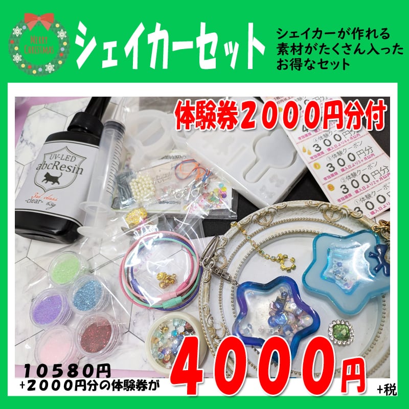 【クリスマスシェイカーセット】モールド/レジン/パーツ/クリスマスプレゼントに♪ クリスマスの贈り物にぴったりな「クリスマスシェイカーセット」で、今年のホリデーシーズンを特別なものにしませんか? このセットには、レジン液、モールド、フィルム、封入パーツ、そしてキーホルダーの金具など、必要な材料が揃っています。 これらの素材を使って、心を込めて手作りのキーホルダーを作りましょう。 中身が動くシェイカーキーホルダーは、見るたびに楽しい気持ちを運んでくれます。 透明感のあるレジンにクリスマスをイメージした小さなパーツを入れて、自分だけのオリジナルな世界を作り上げることができます。 手作りの温かみが感じられるこのアイテムは、家族や友達、そして自分自身への素敵なギフトとして最適です。 「何を揃えたら良いのかわからない」と感じている初心者の方にも安心してお使いいただけます。 セットになっているので、すぐに作り始められますよ。 手作りの楽しさを感じながら、世界にひとつだけの特別なキーホルダーを作ってみてください。 レジン液は日本製で安心安全にお使い頂けます。 アレルギーになりにくい物になります。(人に個人差があるため必ずではございません。) クリアのレジン液ですので、着色剤で色をつけてお使い下さい。 大須にある店舗2号店で使える体験クーポン2000円分もついてくる!! お近くにお住まいの方で、レジンを始めたばかりで作り方が分からないかたは、2号店にてシェイカーの体験も行っております。 その他にもいろんなレジンの体験がございます。