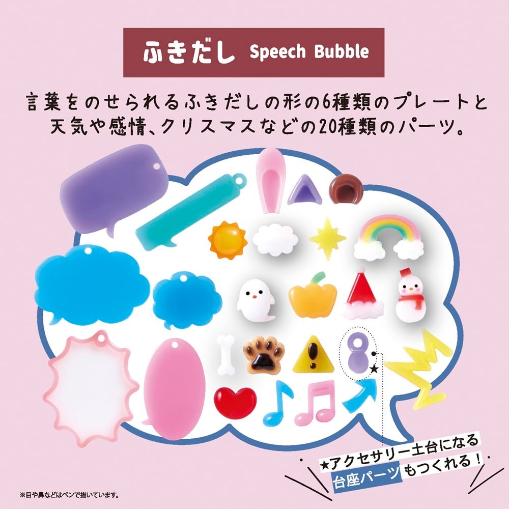 言葉をのせられるふきだしの形の6種類のプレートと、天気や感情、クリスマスなどの20種類のパーツが揃っています。