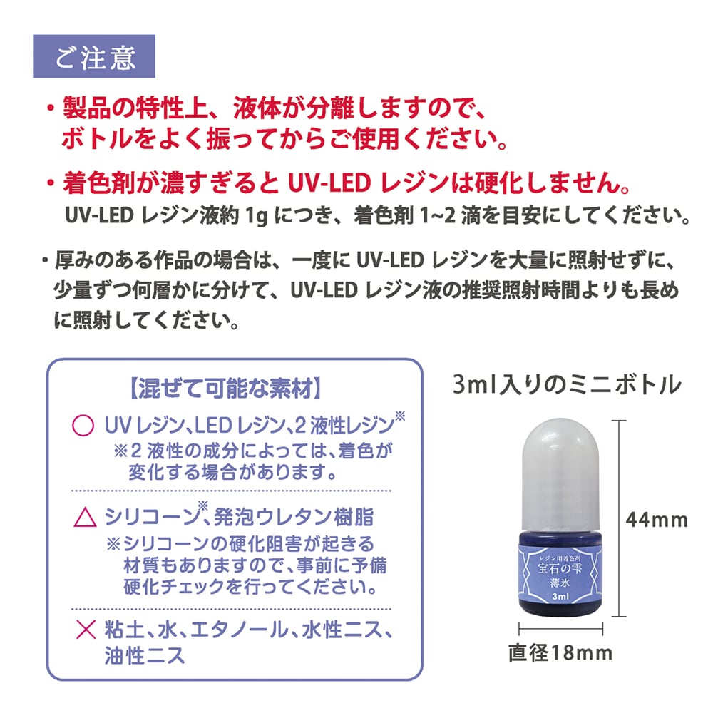 UVレジン液約1gにつき、着色剤を1.2滴を目安にしてください。