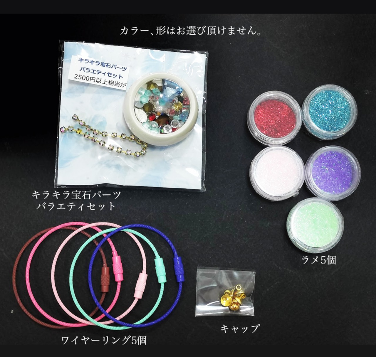 このセットには、レジン液、モールド、フィルム、封入パーツ、そしてキーホルダーの金具など、必要な材料が揃っています。