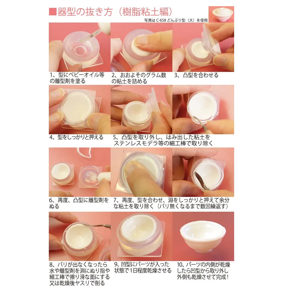 樹脂粘土をはじめとする自然乾燥粘土、オーブン粘土、UVレジンなどでご使用頂ける便利なシリコーン型です。