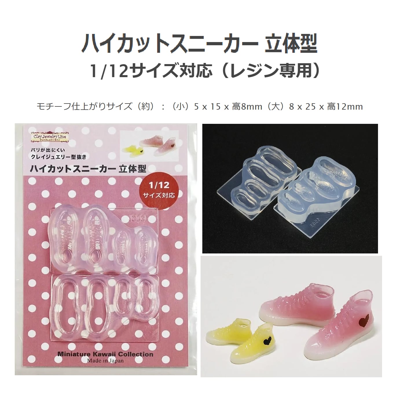 2サイズのハイカットスニーカーモチーフが手軽に作れます。ミニチュア作品で人気のある1/12サイズ対応。
