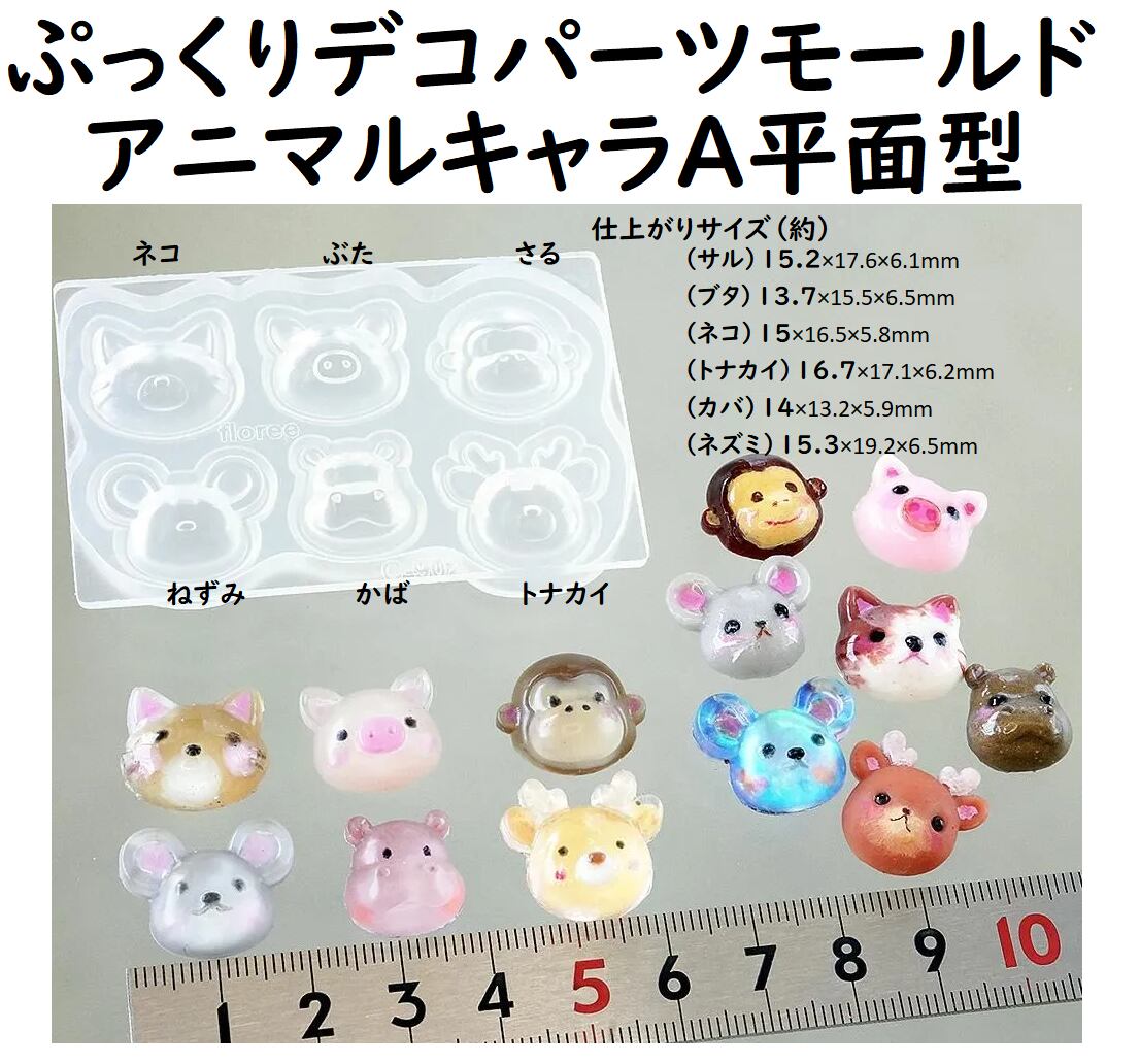 【アニマルキャラA平面型】ぷっくりデコパーツモールド/ネコ/サル/ブタ/トナカイ/カバ/ネズミ/デコパーツ/手作りシール
