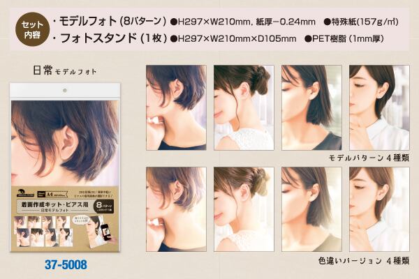 8パターンのモデルフォトとA4サイズの専用フォトスタンドが付いたセットです。