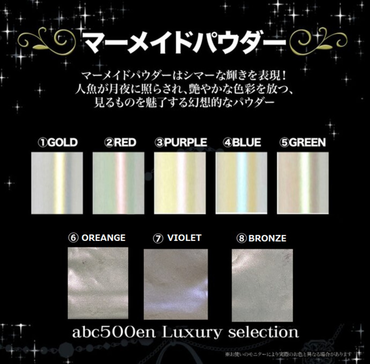 マーメイドパウダーはシマーな輝きを放つ、abc500enオリジナルの顔料。