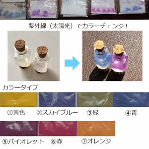紫外線UVパウダーは、日差しによって色が変化する不思議な顔料です。白色のパウダーから太陽の光に当たると、マジックのように色が変わります。色は様々で、赤、青、緑、オレンジなど様々な色へと変化します。